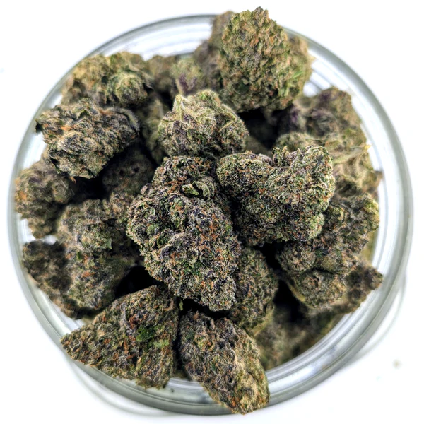 Tightly packed buds coated in crystal trichomes, showing off shades of olive green and deep purple. Fiery orange hairs wrap around every nug, giving it standout bag appeal.